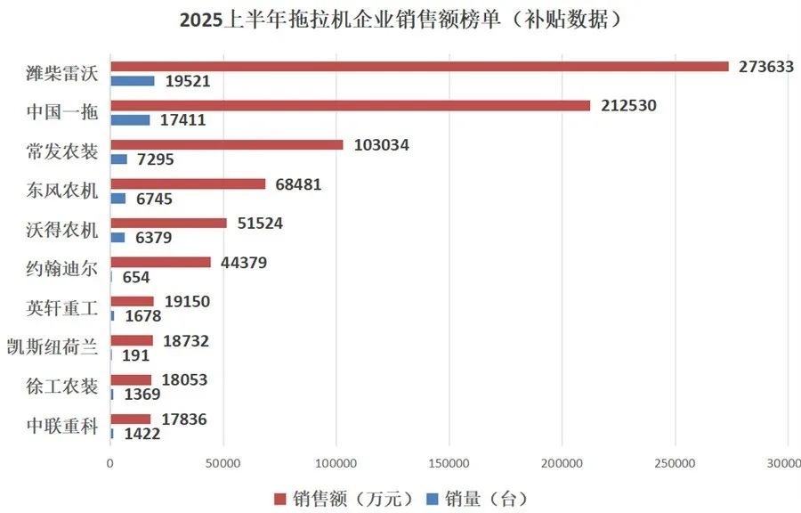 In the first half of 2025, the Chinese tractor industry will enter a period of deep adjustment under multiple pressures. On the one hand, market demand is suppressed by factors such as low grain prices and overcapacity, and the industry as a whole is showing a weak trend of "not thriving during peak seasons"; On the other hand, policy driven and technological iteration are reshaping the logic of industrial competition, with intelligence, new energy, and high-end becoming key breakthroughs. According to the latest publicly available data on agricultural machinery purchase subsidies, industry concentration continues to increase, with top enterprises stabilizing their positions through economies of scale and technological advantages, while small and medium-sized enterprises seek breakthroughs in differentiated competition.According to publicly available data on agricultural machinery purchase subsidies, the sales volume of tractors in the first half of 2025 exceeded 90000 units, with a sales revenue of around 10.43 billion yuan, a year-on-year decrease of 38%. Among them, there are a total of 3 enterprises with tractor sales exceeding 1 billion yuan, a decrease of 1 compared to the same period last year; There are a total of 14 enterprises with over 100 million yuan, a decrease of 8 compared to the same period last year. The top five companies in terms of sales have a market share of nearly 70%.